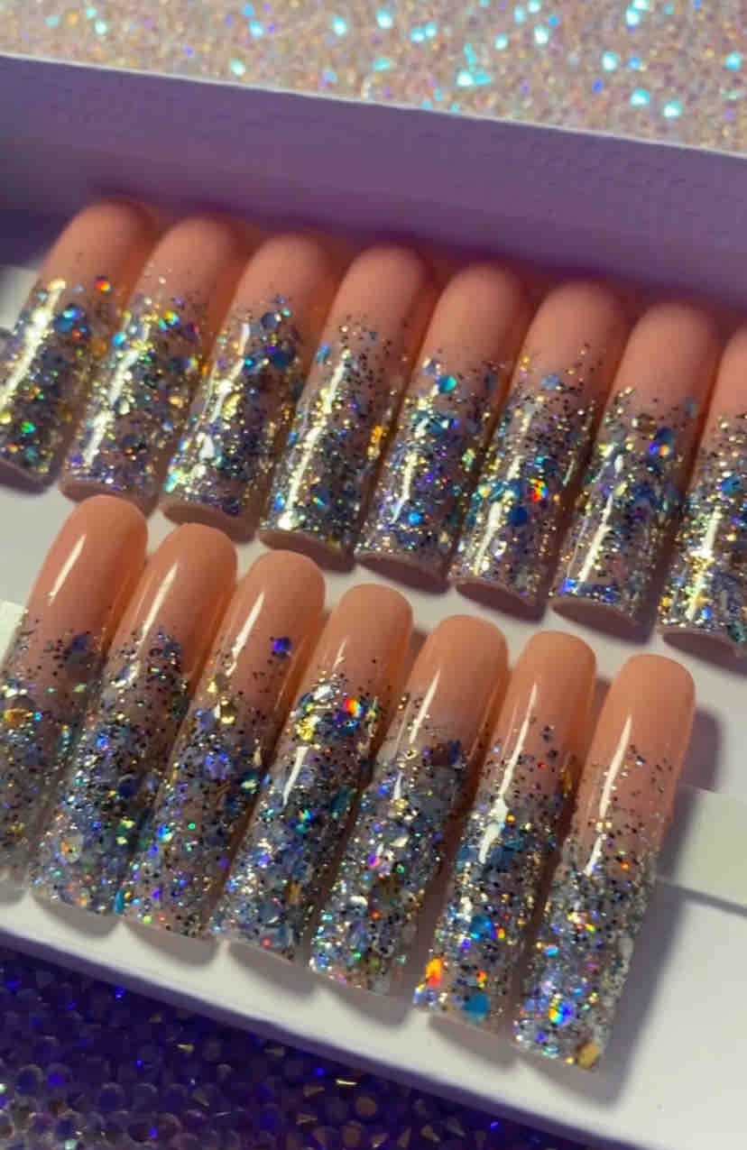 A set of 24 full cover press-on nails in an ombre glitter pattern