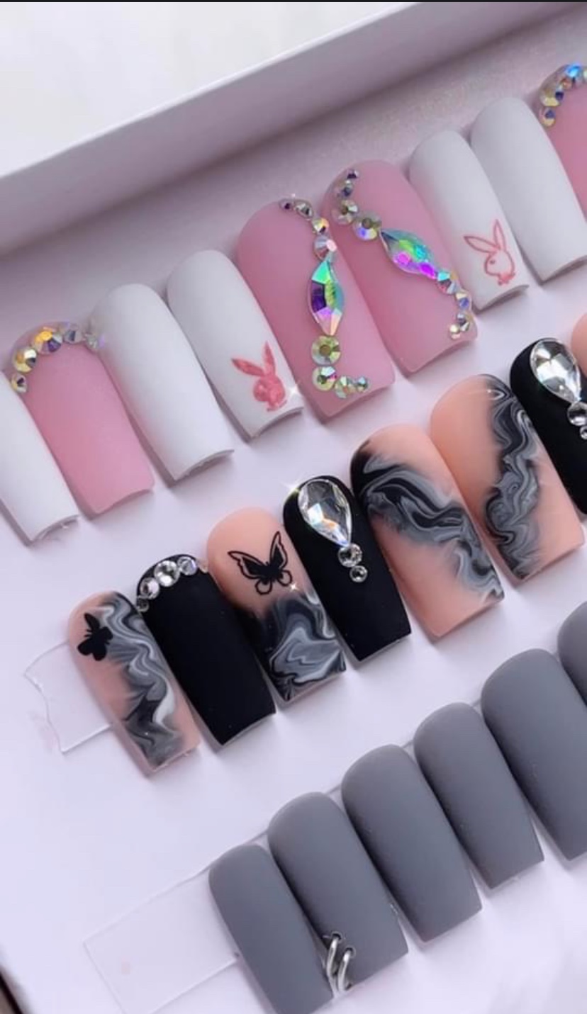 Our press-on nails are easy to apply and can last up to two weeks.